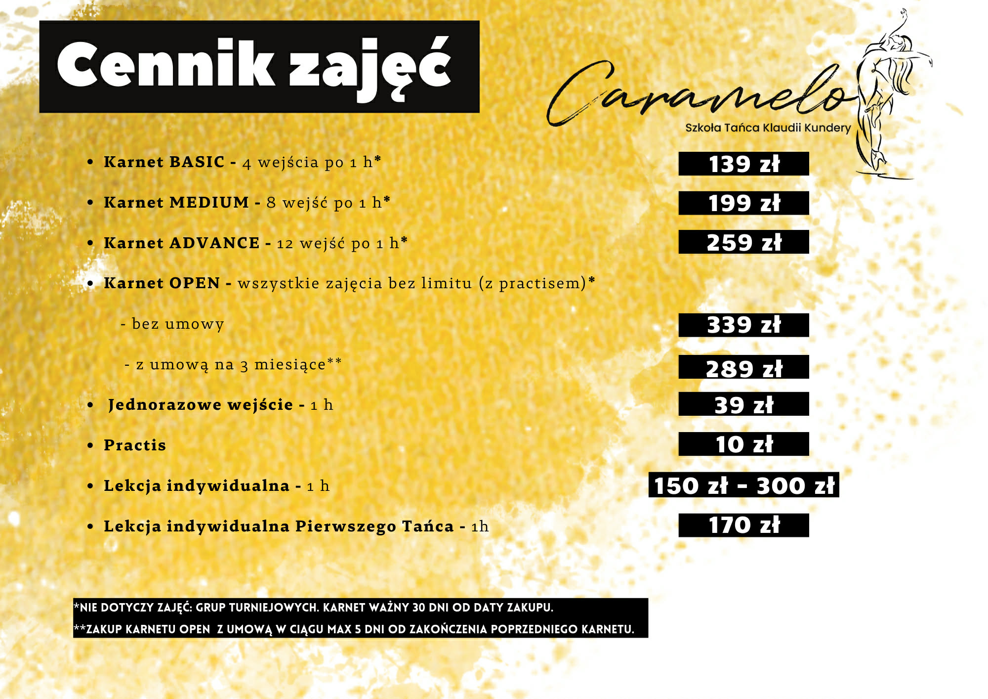 W Caramelo staramy się, aby nasze ceny były atrakcyjne i dostępne dla każdego, kto chce nauczyć się tańczyć. Oferujemy różne pakiety cenowe, które są dostosowane do odmiennych poziomów zaawansowania i preferencji klientów. Nasz cennik jest przejrzysty i bez ukrytych opłat. Zapraszamy do zapoznania się z ofertą i wyboru najlepszego dla siebie pakietu.